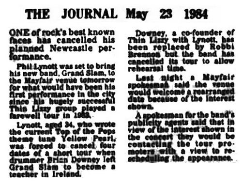SLAM IRISH TOUR APR-84 Philip Lynott, Laurence Archer, Robbie Brennan, Doishe Nagle, Mark Stanway Brian Downey quit the band three days before the first gig. ![]() |