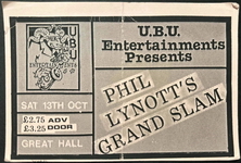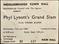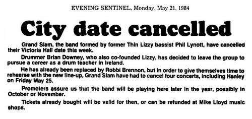 SLAM IRISH TOUR APR-84 Philip Lynott, Laurence Archer, Robbie Brennan, Doishe Nagle, Mark Stanway Brian Downey quit the band three days before the first gig. ![]() |